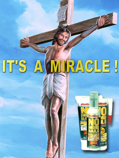 اذا لم تستحي فافعل ما تشاء دعاية او اعلان لغراء صورة يسوع معلق بالغراء بدلا من المسامير الهذه الدرجة وصل بهم الامر بالاستهزاء بمعبودهم .