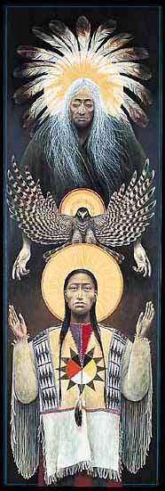 الثالوث المُقدس كما تصوره الهنود الحُمر....ربما كان فى أحد أساطيرهم...أو وسيلة لتقريب مفهوم التثليث لدى المُستعبدين من الهنود الحمر من قَبل مُستعمرى أمريكا الأوائل من الإنجليين....الذين كانوا يعتبرون مُهمتهم فى أمريكا مُهمة مُقدسة....و كانوا يُسمون أنفسهم بالحُجاج......و كأنهم فى رحلة للأرض المُقدسة......و من ضمن مُهمتهم المُقدسة تنصير ما تبقى من هنود أمريكا، ممن نجى من المذابح التى إرتكبها هؤلاء الحُجاج!!!!
