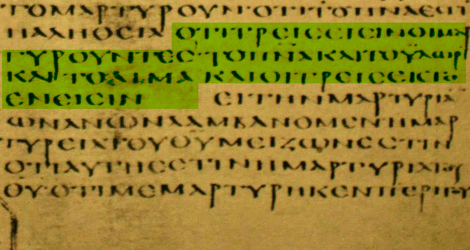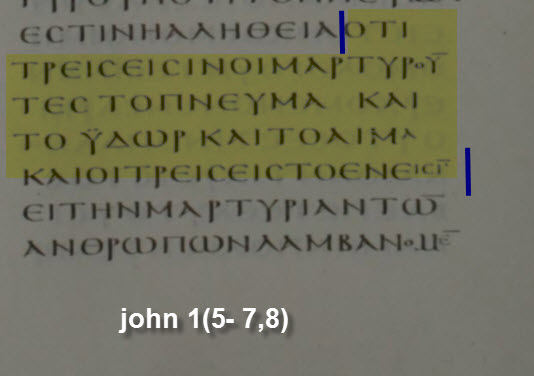 8- καὶ τρεῖς εἰσιν οι μαρτυροῦντες ἐν τῇ γῇ, τὸ Πνεῦμα καὶ τὸ ὕδωρ καὶ τὸ αἷμα, καὶ οἱ τρεῖς εἰς τὸ ἕν εἰσιν.