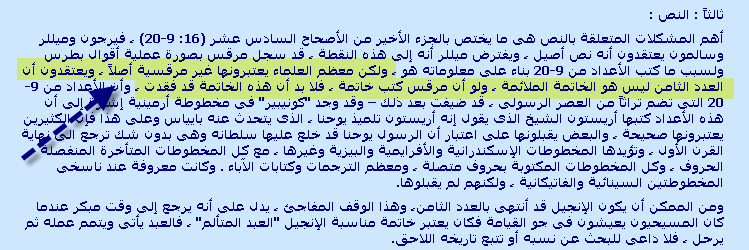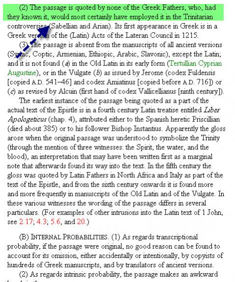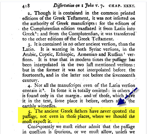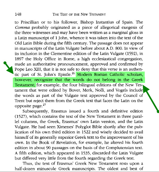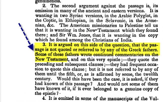 فبعد أن أكد الكلام السابق .. قال ان الفاصلة اليوحانوية تم حذفها من كل النسخ اليونانية الحديثة للعهد الجديد ....