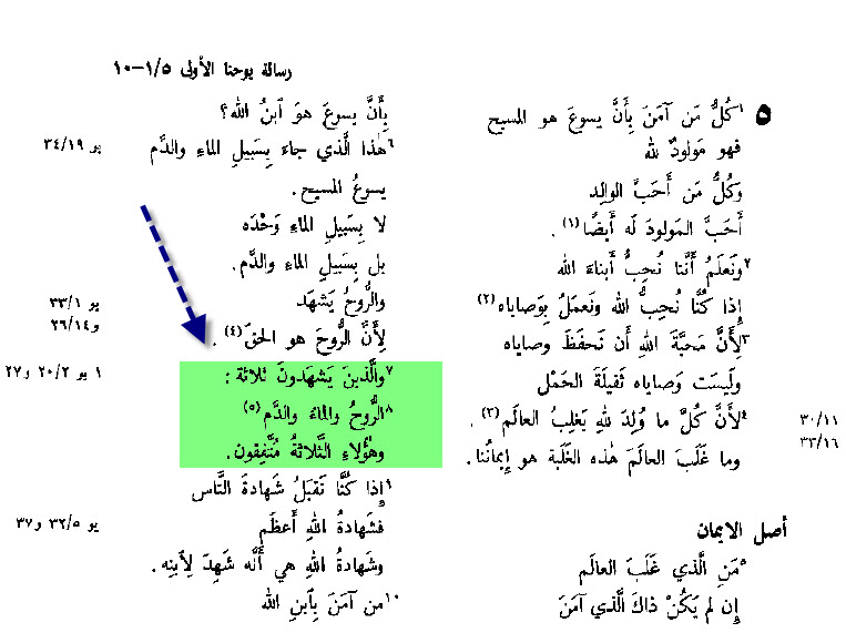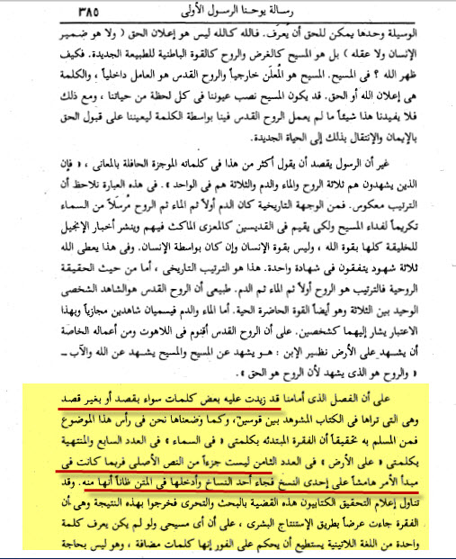 على أن الفصل الذي أمامنا قد زيدت عليه بعض الكلمات سواء بقصد أو بغير قصد وهي التي تراها في الكتاب المشوهد بين قوسين، وكما وضعنا نحن في رأس هذا الموضوع فمن المسلم به تحقيقاً أن الفقرة المبتدئة بكلمتي « في السماء » في العدد السابع والمنتهية بكلمتي « على الأرض » في العدد الثامن ليست جزءاً من النص الأصلي فربما كانت في مبدأ الأمر هامشاً على إحدى النسخ فجاء أحد النساخ وأدخلها في المتن ظاناً أنها منه. وقد تناول إعلام التحقيق الكتابيون هذه القضية بالبحث والتحري فخرجوا بهذه النتيجة وهي أن الفقرة جاءت عرضاً بطريق الاستنتاج البشري، على أن أي مسيحي ولو لم يكن يعرف كلمة واحدة من اللغة اللاتينية يستطيع أن يحكم على الفور إنها كلمات مضافة، وهو ليس بحاجة إلى رجال العلم أو أبحاثهم ليقرر أن الفقرة زائدة. فإن كلمة الله جامعة مانعة وتحمل في ذاتها دليل كفايتها.