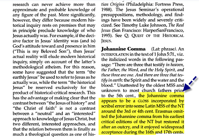 كان هناك انتقاد موجة الى ارازموس ( صاحب اول طبعة للعهد الجديد ) ...ان نصة لا يوجد بة نص الثالوث (الأب ، الكلمة و الروح القدس و هؤلاء الثلاثة واحد) ...