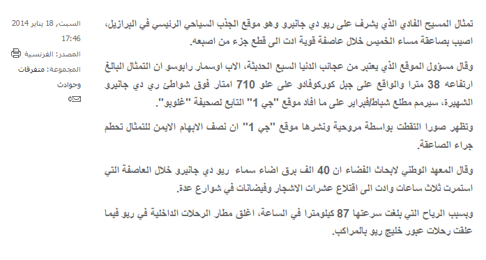 فقد تمثال يسوع ذو الذراعين المفتوحتين جزء من إبهامه نتيجة لصاعقة ضربت مدينة ريودي جانيرو الخميس الماضي ، وقد صرّح "الأب" Osmar Raposo بأنّ أشغال إعادة التمثال لحالته الأولى ستبدأ مطلع شهر فبراير القادم .