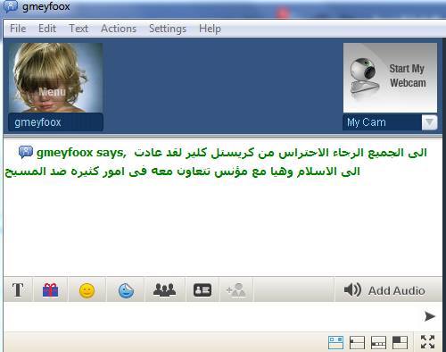 ودخلت الى البالتوك لتبشر بالمحبة والمودة وبالرب محبة يسوع وتنقلت بين الغرف البالتوك الحوار الاسلامي المسيحي وحطت رحالها في غرفة مغاربة ضد التنصير والالحاد