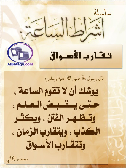 يقول فضيلة الشيخ المنجد: "تقارب الأسواق، وهذه يشمل سرعة العلم فيها، وسرعة السير من سوقٍ إلى سوقٍ ومقاربة بعضها بعضاً في المكان والأسعار، فبين كل سوقين سوق، وهذا مشاهد اليوم في عالم المولات فكثرتها ولا شك مما أخبر عنه النبي -صلى الله عليه وسلم- تقارب الأسواق وكثرة الأسواق، وقد صارت الأسواق في الشبكات يفتحون منها ما يشاءون"