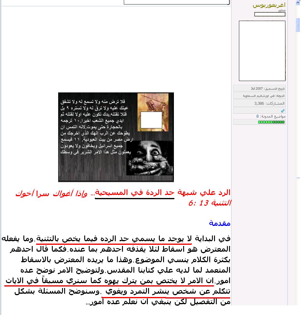 و لا يعلم أنّ مِن أحد أسباب تطبيق حد الردة فى الإسلام هو الغواية و الخيانة العظمى و أنّ المرتد يمثل خطر عام على حد قوله فهو بذلك أثبت نصف حد الردة فى مسيحيته و نحن نثبت له النصف الأخر