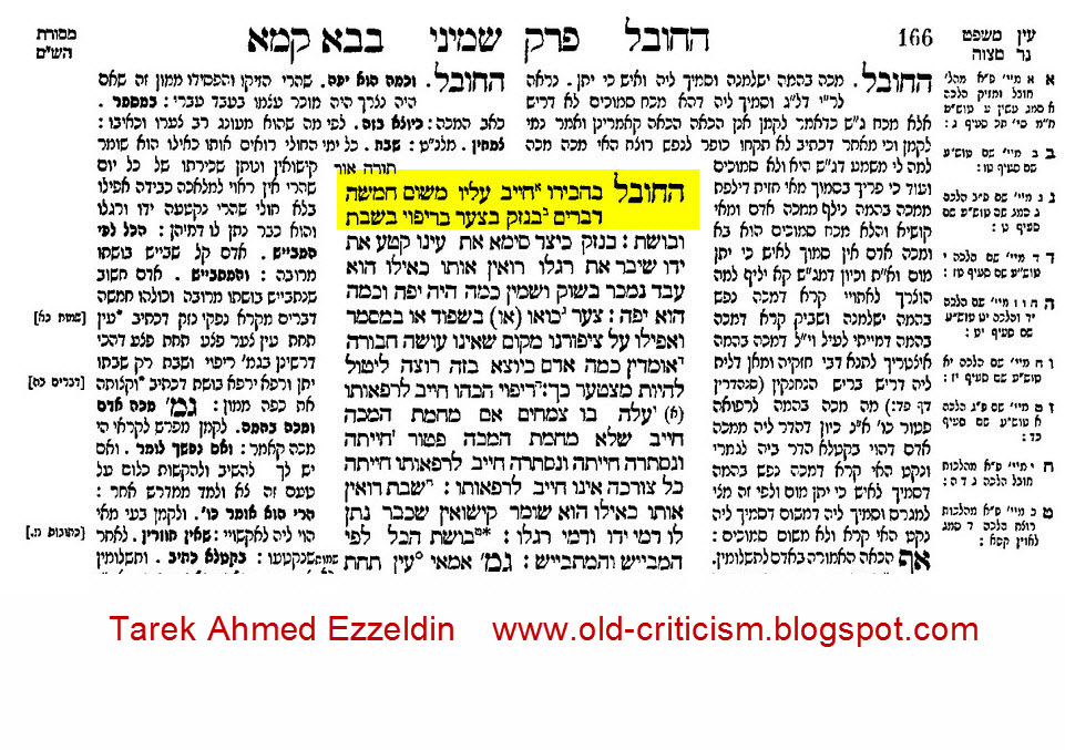 الترجمة : ومثال على الاختلاف بين الشريعه المكتوبة والشريعه الشفوية ... فالشريعة المكتوبة تحدد العقاب الكافي للمعاقبة بخصوص الايذاء البدني، بينما تحدد الشريعة الشفوية العقاب الكافي لذلك عن طريق التعويض المادي، وبما انه من المستحيل تنفيذ كلا الحكمين كل حكم بمفرده على حدا في نفس الوقت فان الفقهاء والعلماء فضلوا التعويض المادي عن العقاب البدني ، ولكن هذا التفسير يثير تساؤلا : اذا كانت الشريعه المكتوبة تقضي بتحقيق العقاب البدني وتعطيها الافضلية، فلماذا تشير تفسيرات الربانيم واقوالهم الي عكس ذلك ؟ وفقا لذلك التفسير المقدم فان السبب وراء هذا التجديد امر سهل الاستيعاب ذلك بان هذا تم استجابة وانعكاس للظروف الطارئة والمتغيرة .