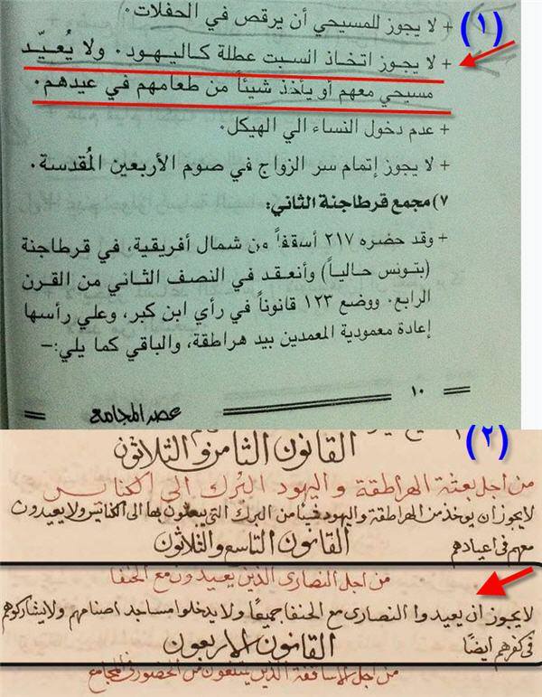 (1) : هذه الصورة من كتاب ( عصر المجامع صـ 10 - من قوانين مجمع اللاذقية بسوريا - تأليف كيرلس الانطوني إشراف دكتور ميخائيل مكسي اسكندر وتحت إشراف الأنبا متاؤس) ومحتواها ( لا يجوز اتخاذ السبت عطلة كاليهود , ولا يُعَيّد مسيحي معهم أو يأخذ شيئًا من طعامهم في عيدهم ).