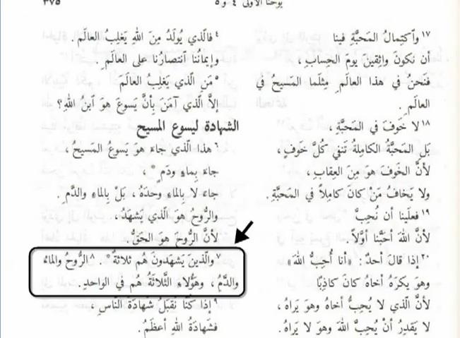 فَإِنَّ الَّذِينَ يَشْهَدُونَ فِي السَّمَاءِ هُمْ ثَلاَثَةٌ: الآبُ، وَالْكَلِمَةُ، وَالرُّوحُ الْقُدُسُ. وَهؤُلاَءِ الثَّلاَثَةُ هُمْ وَاحِدٌ.