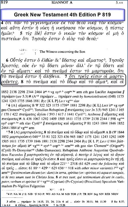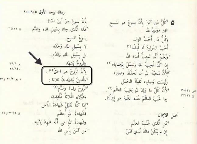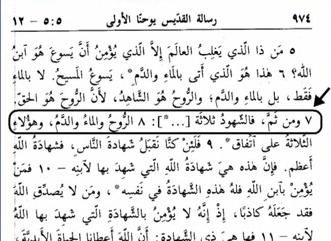 مرجع : العهد الجديد – يونانى عربى – ترجمة ما بين السطور - شارك فيها الخورى بولس الفغالى - – رسالة يوحنا الأولى 5 : 7