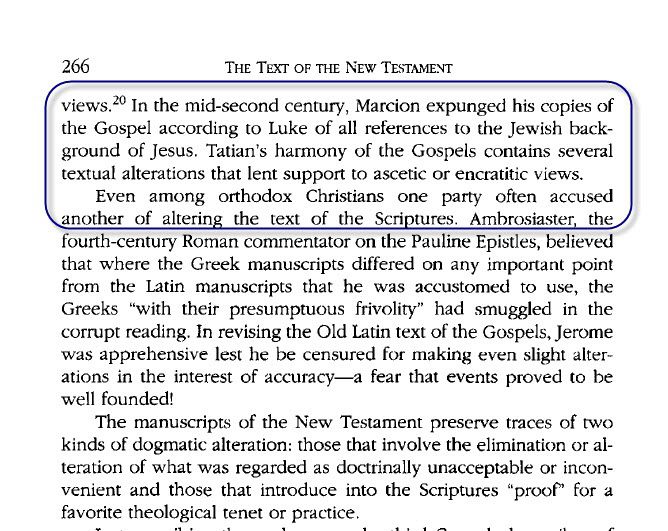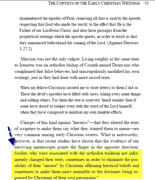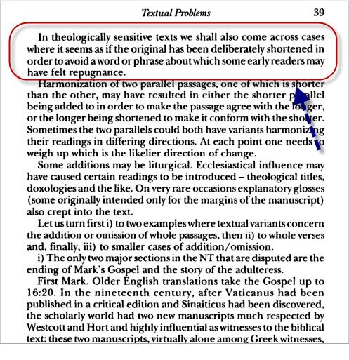 دكتور بارت إيرمان "كان يتم التبديل فى نصوص العهد الجديد .. لأسباب لاهوتية... فكان الناسخ يريد ان تقول النصوص ما يقوله .... واحيانا كان هذا بسبب الخلافات اللاهوتية ...!!!