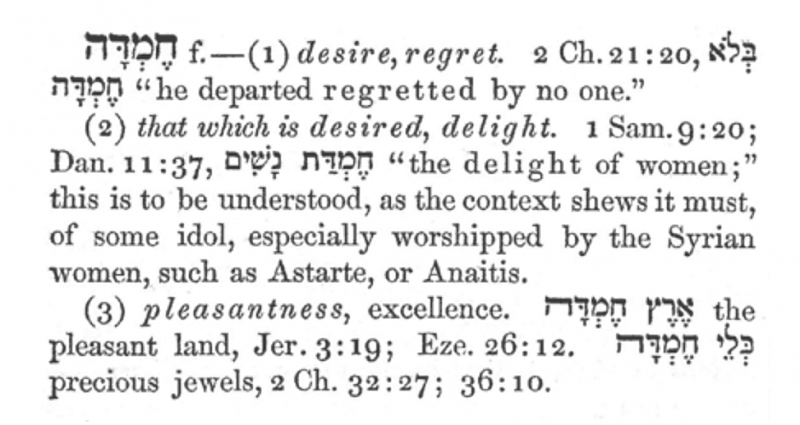 الكلمة العبرية حسب النص الماسوري חֶמְדָּה و هي تعني المرغوب او المشتهى او المحمود