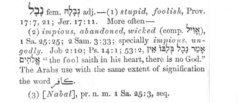 I. נָבָל adjective foolish, senseless, especially of the man who has no perception of ethical and religious claims, and with collateral idea of ignoble, disgraceful; — absolute ׳נ 2 Samuel 3:33 14t.; masculine plural נְבָלִים 2 Samuel 13:13; Ezekiel 13:3 (ᵐ5 Co מִלִּבָּם); feminine plural נְבָלוֺת Job 2:10; — senseless, especially of religious and moral insensibility: ׳עַם נ Deuteronomy 32:6 (of Israel, unappreciative of J.'s benefits; opposed to חָכָם), so of heathen nation Psalm 74:18 (blaspheming name of ׳י), ׳גּוֺי נ Deuteronomy 32:21