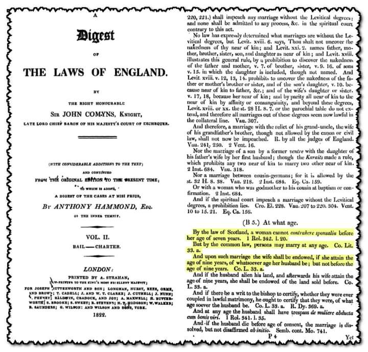 "بموجب قانون استكلندا قبل القرن العشرين كان يجوز لأي فتاة إذا بلغ سنها تسع سنوات أن تتزوج مهما كان سن زوجها."