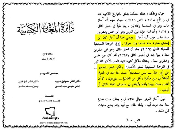 "تخبرنا دائرة المعارف المسيحية أن الزواج في العمر الصغير ليس مستحيلاً حيث أننا نجد في الشرق أطفالاً في سن مبكرة أقل من العاشرة يتزوجون كما أن أغلب ملوك يهوذا ولدوا وآباؤهم في منتصف العقد الثاني وآحاز أحد أعظم ملوك يهوذا كان ابن إحدى عشرة سنة عندما ولد ابنه حزقيا"