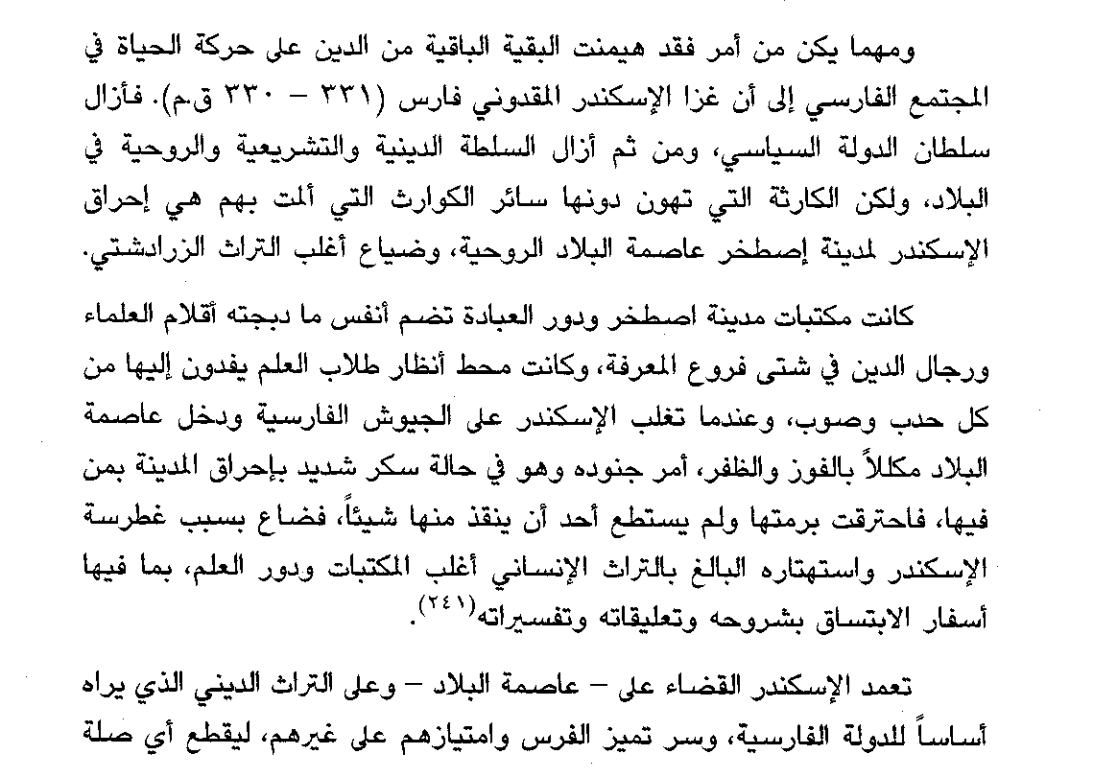 ((و لكن الكارثة التي تهون دونها سائر الكوارث التي المت بهم هي احراق الاسكندر لمدينة اصطخر عاصمة البلاد الروحية وضياع اغلب التراث الزرادشتي ...فاحترقت برمتها و لم يستطع احد ان ينقذ منها شيئا فضاع بسبب غطرسة الاسكندر و استهتاره البالغ بالتراث الانساني اغلب المكتبات ودور العلم بما فيها اسفار الابستاق بشروحه و تعليقاته و تفسيراته ... ))