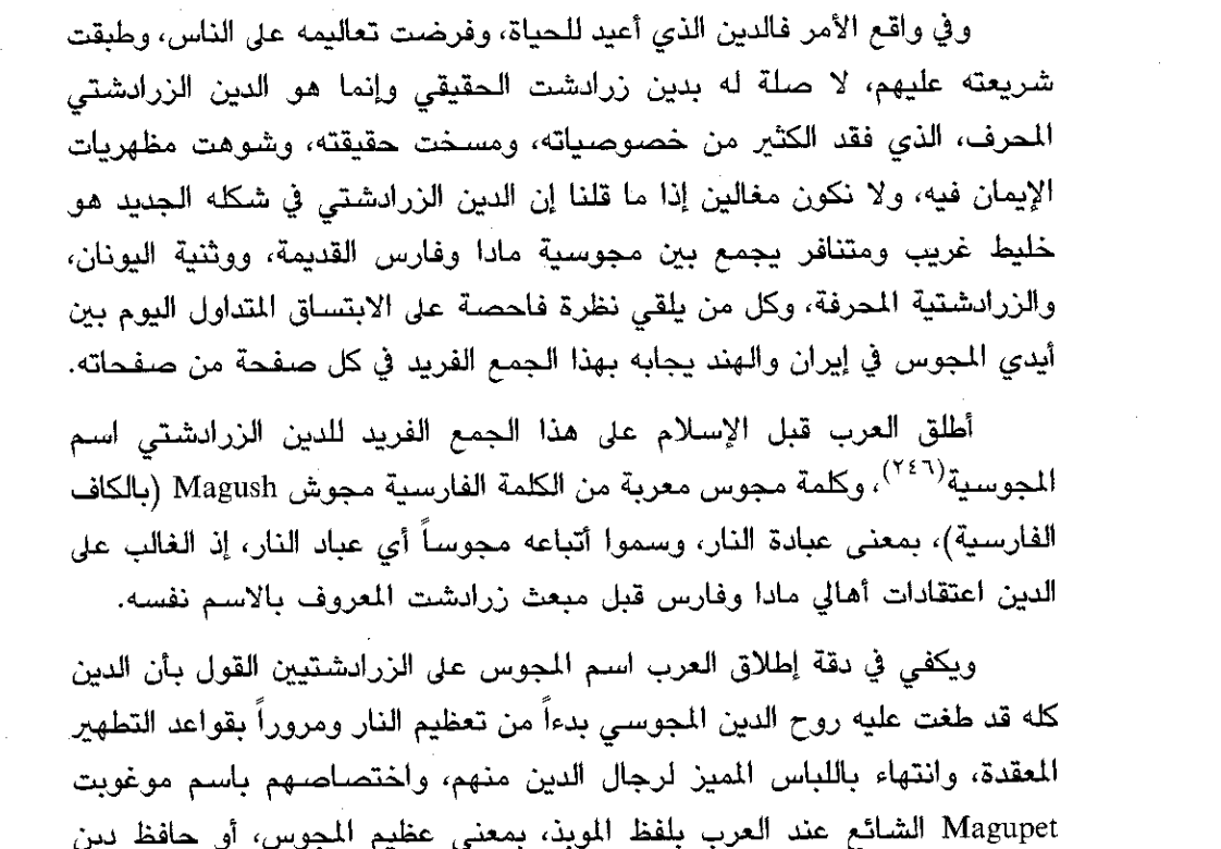 (( و في واقع الامر الدين الذي اعيد للحياة و فرضت تعاليمه على الناس وطبقت شريعته عليهم لا صلة له بدين زرادشت الحقيقي و انما هو الدين الزرادشتي المحرف الذي فقد كثير من خصوصياته و مسخت حقيقته وشوهت مظهريات الايمان فيه و لا نكون مغالين اذا قلنا ان الدين الزرادشتي في شكله الجديد هو خليط غريب و متنافر يجمع بين مجوسية مادا وفارس القديمة ووثنية اليونان و ازرادشتية المحرفة و كل من يلقي نظرة فاحصة على الابستاق المتداول اليوم بين ايدي المجوس في ايران و الهند يجابه بهذا الجمع الفريد في كل صفحة من صفحاته ))