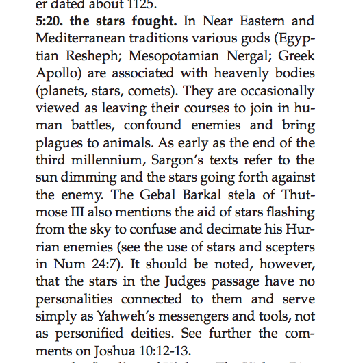 (( 5:20. the stars fought. In Near Eastern and Mediterranean traditions various gods (Egyptian Resheph; Mesopotamian Nergal; GreekApollo) are associated with heavenly bodies(planets, stars, comets). They are occasionally viewed as leaving their courses to join in human battles, confound enemies and bring plagues to animals. As early as the end of the third millennium, Sargon’s texts refer to the sun dimming and the stars going forth against the enemy. The Gebal Barkal stela of Thutmose III also mentions the aid of stars *****ing from the sky to confuse and decimate his Hurrian enemies (see the use of stars and scepters in Num 24:7). It should be noted, however,that the stars in the Judges passage have no personalities connected to them and serve simply as Yahweh’s messengers and tools, not as personified deities. See further the comments on Joshua 10:12-13 ))