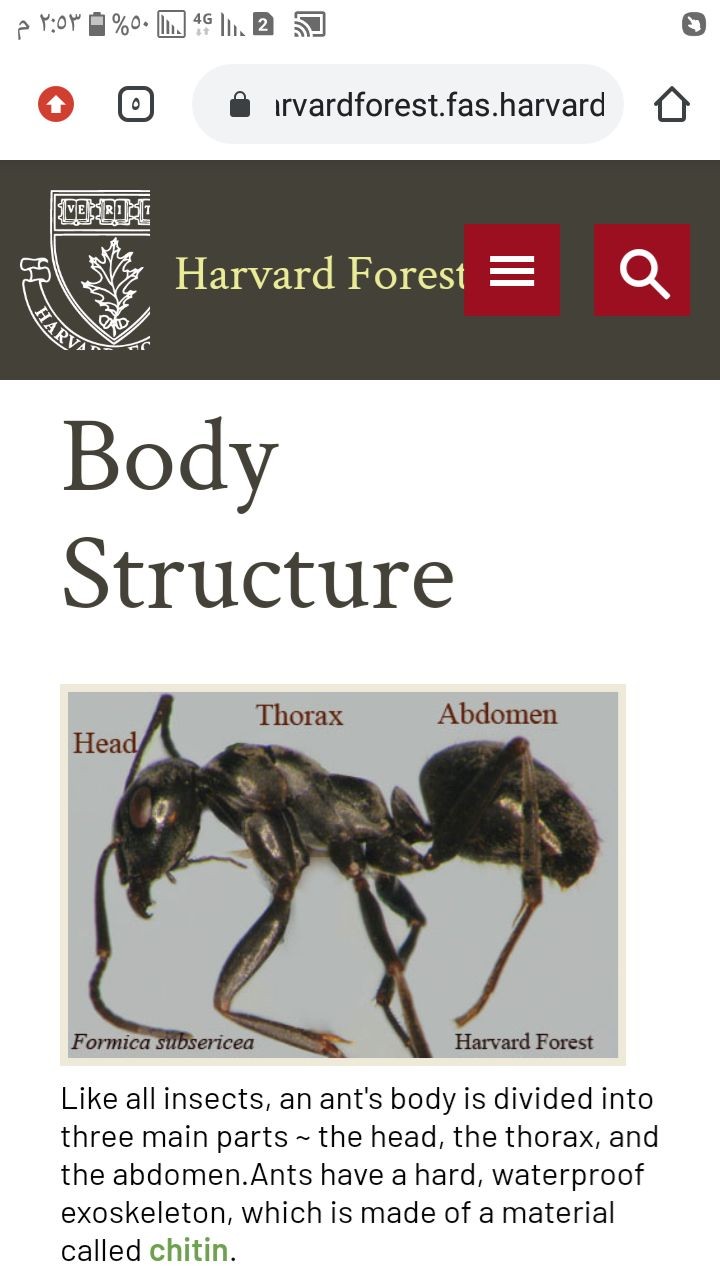 Like all insects, an ant's body is divided into three main parts ~ the head, the thorax, and the abdomen.Ants have a hard, waterproof exoskeleton, which is made of a material called chitin.