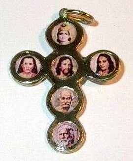 Above: A "Hindu cross" I have (blown up -- the actual size is much smaller) with Paramahansa Yogananda (center right) and "the Line of Gurus" including Jesus Christ (center), Lord Krishna (top), Mahavatar Babaji (left), Lahiri Mahasaya (below Jesus) and Swami Sri Yukteswar (bottom).