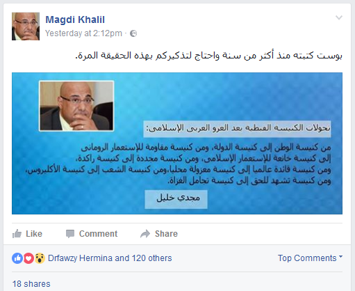 و يستمر غباء أحفاد "كيرلس الكبير " قاتل الفيلسوفة "هيباتيا " و عنصرية تنظيم "الأمة القبطية " الإرهابي ضد كل ما هو غير مسيحي و غير مرشوم ما عدا الفراعنة (مع أن الفراعنة كانوا أمة وثنية ) دليل على تخلفهم و همجيتهم يبغونها عوجا لكن هيهات .