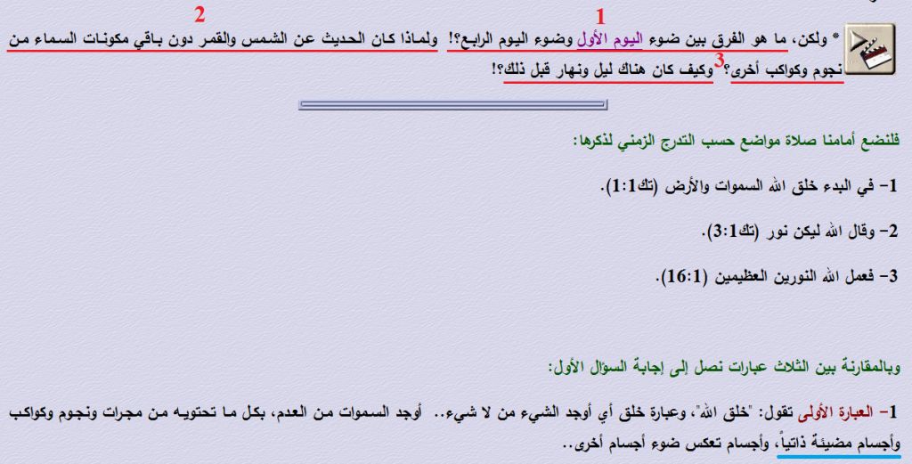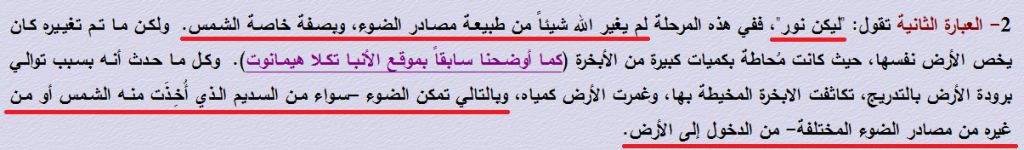 - ثم في اليوم الرابع تم عمل الشمس والقمر وهذا يعني أنهما كانا موجودان ثم ازدادت قوة إضاءة الشمس