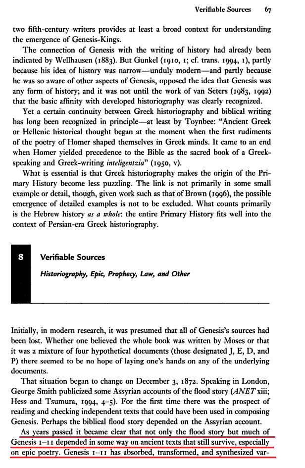 "أنه مع مرور السنين يتضح أكثر أنه ليس فقط قصة الطوفان ولكن معظم سفر التكوين (1 - 11) يعتمد بطريقة ما على بعض الكتابات القديمة التي لا تزال موجودة إلى اليوم مثل الأساطير الشعرية القديمة. فسفر التكوين امتُص من وحُوِّل وصنِع من أسطورة جلجامش وأسطورة أتراهاسيس وأسطورة إينوما إيليش.