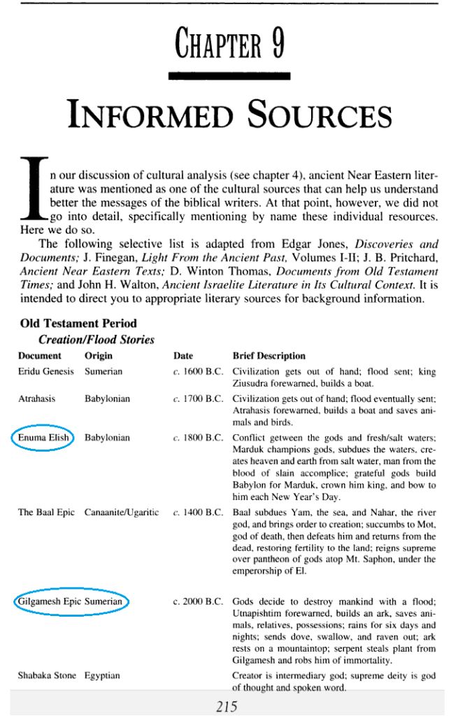 وفي الفصل التاسع يذكر هذه الكتابات التي يجب قراءتها لفهم الكتاب المقدس ويذكر عدة أساطير منها الأسطورة البابلية لبدء الخليقة Enuma Elish