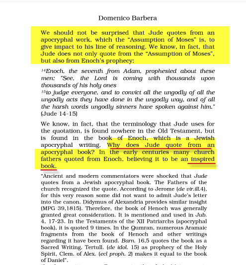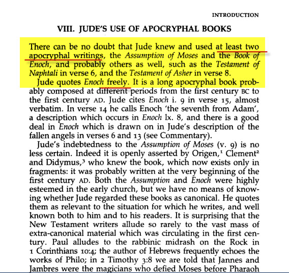 فلا شك ان يهوذا أستخدم كتابين من كتب الاوكريفا ... وهم صعود موسى وأخنوخ وربما كتب أخرى ... وأقتبس منهما بحرية (2)