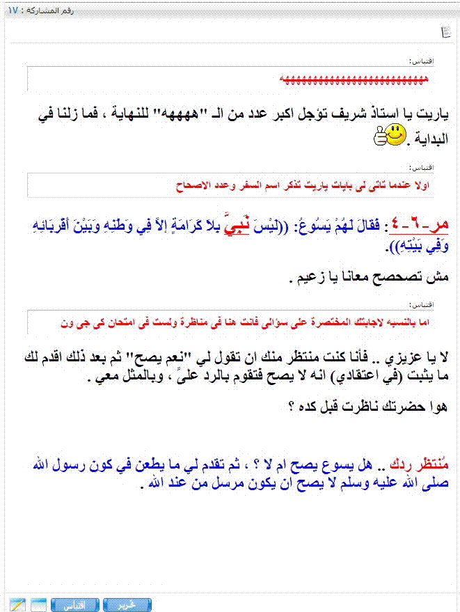 ويقول لي أن تكون إجابتي بالأدلة عندما سألني وقال "هل محمد يصح ان يكون رسول و مرسل من عند الله؟" ... هناك ملايين الأدلة على أن محمد :salla-s: رسول الله , ولكن لابد من إجابة مبدئية , وبعدها يقدم هو ما يطعن في كون رسول الله :salla-s: لا يصح ان يكون مرسل من عند الله وسأقوم بالرد عليه .. أليس كذلك ؟