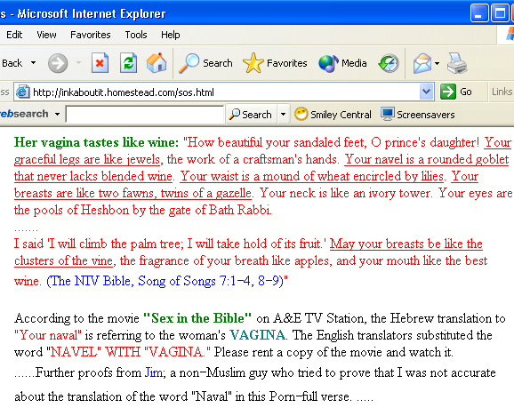 فطبقاً للفيلمِ "جنس في الكتاب المقدس " على A&E TV Station ، الترجمة العبرية لكلمة "سرة" تشير إلى "مهبلِ الإمرأةَ". إستبدلَ المترجمونُ الإنجليزُ "سرةُ" الكلمةَ مَع "مهبل."