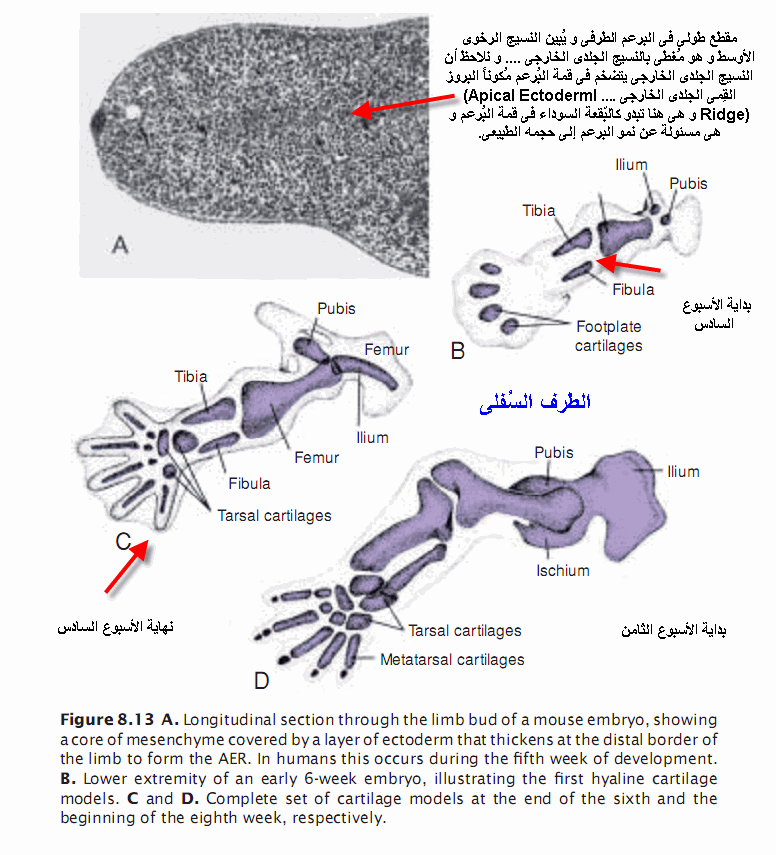 فالأطراف تبدأ كبراعم طرفية من جانبى الجسم و تتكون من غطاء من الجلد الخارجى محشو بالميزنكايم (أو النسيج الرخوى الأوسط).......حيث يبدأ البرعم العلوى فى الظهور فى اليوم 24 و البرعم السفلى فى اليوم 28 أى فى نهاية الأربع أسابيع الأولى.