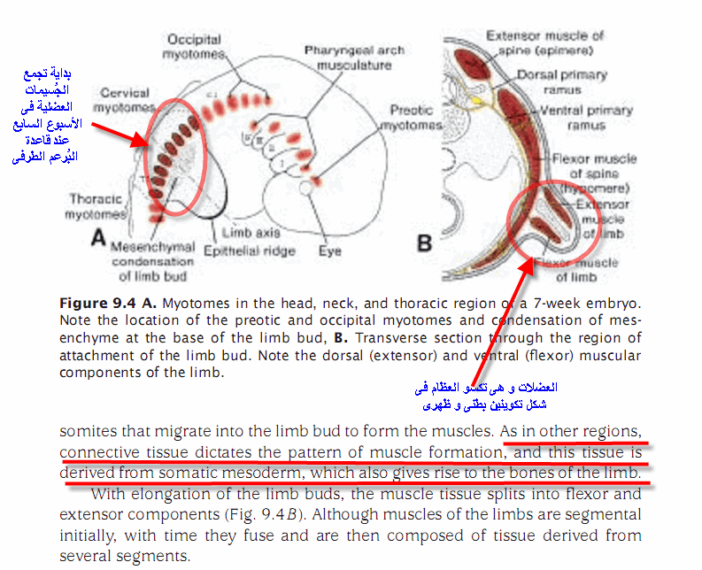 أو هجرة الخلايا العضلية..... فالخلايا العضلية تتكون أساساً فى بجوار المحور الرأسى الأوسط للجنين......من النسيج الجلدى الأوسط (Mesoderm) الذى يتطور فى الجنين بدءاً من اليوم السابع عشر فى تكوينه (paraxial mesoderm) و هو ما ينقسم إلى ما يُسمى بالجُسيمات (Somites) و التى تتطور و تتخصص فى خلال الأسبوع الرابع إلى ميزنكايم (أو نسيج رخوى أوسط) و هو أساس النسيج الضام للجنين حديث التكوين و من خلاله تتشكل العظام و الغضروف و النسيج الضام ..... و ديرمو – مايوتوم ( أو الجُسيمات العضلية الجلدية).... و هى التى تتطور فيما بعد إلى العضلات و أدمة الجلد ( و ليس الجلد الذى نعرفه ، بل هى الطبقة الداخلية السميكة من الجلد و التى تُسمى بالأدمة ، بينما الطبقة الخارجية من الجلد بما فيها عناصر تلوين البشرة من خلايا الميلانين فهى من طبقة أخرى تُسمى الطبقة الجلدية الخارجية (ectoderm)..... و المُدلس الصغير يُحاول أن يُقنعنا أن كتابه صحيح، بل به إعجاز علمى عندما يقول (كسوتني جلدا و لحما)..... و هذا طبعاً مُنتهى الإستهبال العلمى...... فمن هو المكسو......فطالما هناك عملية كسى، فهناك كاسى ، و هو هنا الجلد و اللحم ....و لكن لا يوجد من يكسيه.... فالجلد و اللحم فى وضعهما الظهرى كأجزاء مُتراصة (تُشبه الفقرات و لكنها مُنفصلة) ....لا يكسوان شيئاً فى الحقيقة .... بل أنهما مكسيان بالطبقة الجلدية الخارجية (Ectoderm) و مكسوان من الداخل بالطبقة الجلدية الداخلية (Endoderm) كما أنهما يُشكلان جزء طولى صغير يمتد بظهر القرص الجنينى و لا يكسوان شيئاً على الإطلاق..... و إذا قال المُدُلس أن الطبقة الجلدية الخارجية هى المقصود بالجلد...... و هى تكسو باقى الجنين (من ناحية واحدة على الأقل)....فأين اللحم إذن و هو مُجرد جُزر صغيرة مُنعزلة ؟!!!!!