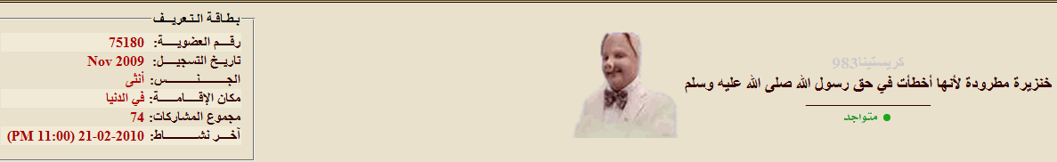 وانت تقصدتي سب رسول الله لأنك جاهلة ولا تفهمي اي شيء ولا تعرفي كيف تتحاوري بعقل وهدوء تقصدتي سب رسول الله :salla-s: بأبي هو وامي ليتم طردك من هنا لانك لستِ أهل للحوار ويا أسافاه على ذكور النصارى تخلوا عنك مفيش ولا يسوعي فيهم ساعدك هل تعلمي لماذا لم يساعدكِ أحد لانهم متأكدين انهم على باطل لا يستطيعوا الدفاع عن هذا الدين الهش وعن كتابك الدموي الارهابي