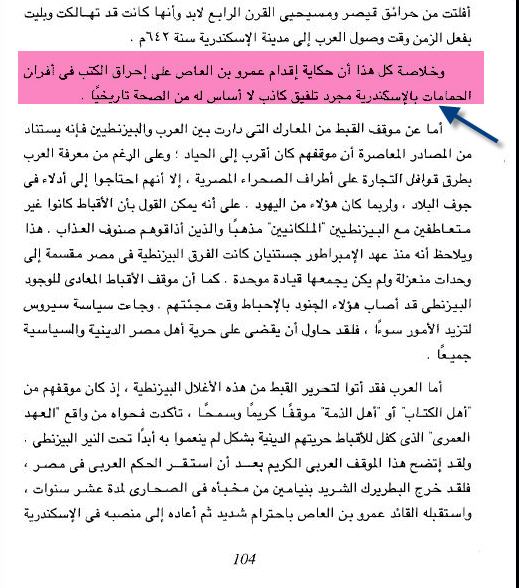 وحاصرها لمدة أربعة عشر شهرا, ودخل الإسكندرية في عام642 والحقيقة المؤكدة أن عند دخول عمرو بن العاص للإسكندرية لم تكن مكتبة الإسكندرية موجودة حتي يحرقها لأنه بالبحث العلمي والتاريخي ثبت أن مكتبة الإسكندرية تم احراقها عن آخرها في عام48 ق.م في زمن الامبراطور يوليوس قيصر امبراطور الدولة الرومانية, ففي عام48 ق.م حضر يوليوس قيصر إلي الإسكندرية لفك النزاع القائم علي حكم مصر بين كليوباترا وأخيها بطليموس الصغير, وقد أحس بطليموس الصغير أن الامبراطور يميل إلي نصرة كليوبترا عليه نظرا لجمالها, وفي أثناء وجود الامبراطور يوليوس قيصر في القصر الملكي في الإسكندرية حاصره بطليموس الصغير بجنوده لذلك طلب يوليوس قيصر النجدة من قوات من بلاد أخري تابعة للامبراطورية الرومانية, وكان يوجد(101) سفينة علي شاطئ البحر الأبيض المتوسط أمام مكتبة الإسكندرية وأمر يوليوس قيصر بحرق المائة سفينة حتي لا تستفيد منها القوات المحاصرة له وامتدت نيران حرق السفن إلي مكتبة الإسكندرية فاحرقتها كلها, وقام مقتل بطليموس الصغير وعين كليوبترا ملكة علي مصر واشرك معها في الحكم أخاها الأصغر بطليموس الرابع عشر, ومن هذا السرد التاريخي يتضح أن الذي حرق مكتبة الإسكندرية هو يوليوس قيصر دون قصد, ومن المعلوم كذلك أنه في عهد عمر بن الخطاب في ربيع الثاني من العام السادس عشر من الهجرة في عام637 م تم فتح بيت المقدس, وكان بيت المقدس به مكتبة كبيرة, ولو كان من عادة المسلمين حرق المكتبات لحرقوا مكتبة بيت المقدس, وكذلك تم فتح دمشق في العام الرابع عشر من الهجرة في عام635 م, وكان بها مكتبة كبيرة, ولم يتم حرقها, وقد تم فتح دمشق بمعرفة أبو عبيدة بن الجراح والثابت كذلك أنه تم فتح الشام في العام الثالث عشر من الهجرة في عام634, وكان بها مكتبة كبيرة ولم يتم حرقها فلم يكن من عادة المسلمين والعرب حرق المكتبات ففي أثناء غزوة يهود خيبر لنقضهم عقد الصحيفة في العام السابع الهجري في عام628 وبعد انتصار الرسول والمسلمين علي سلام بن مشكم زعيم خيبر كان من الغنائم صحائف التوراة وكتب اليهود أمر الرسول بتسليمها إلي يهود خيبر, وهذا يدل علي أنه ليس من سياسة الإسلام حرق كتب ومكتبات الآخرين وإلا كانوا قد احرقوا كل المكتبات في بيت المقدس, وفي دمشق وفي الشام, ولذلك فإن خبر أو واقعة أن عمرو بن العاص هو الذي احرق مكتبة الإسكندرية بعد استئذان الخليفة عمر بن الخطاب واقعة مكذوبة ولا أساس لها من الصحة لأن التاريخ ثابت والتاريخ لا يكذب .