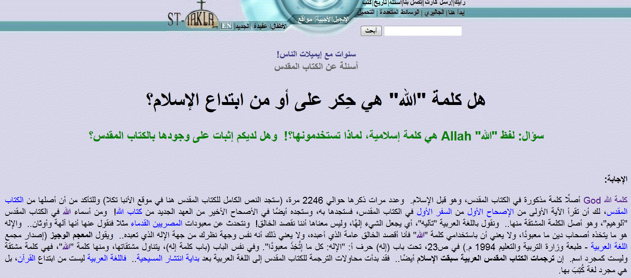 " الله " المذكور في القرآن الكريم هو معبود خاصّ بالعرب و المسلمين ( الوثنيين) و لا علاقة له من قريب أو بعيد بـــ " الله " إلــوهيم معبود اليهود و النّصارى المذكور في تكوين 1 : 1