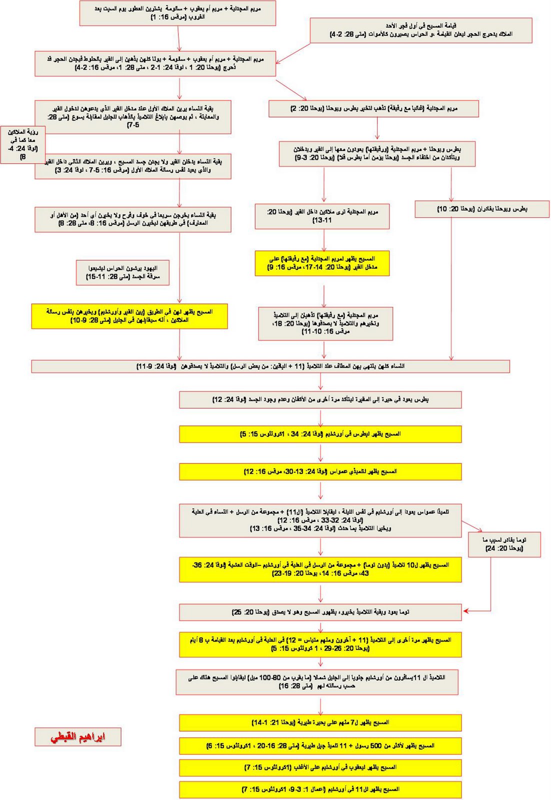 فقد وصلني مؤخرا رسم توضيحي يحاول التوفيق بين روايات الأناجيل الأربعة ....