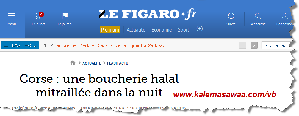 بكورسيكا ، بواسطة مدفع رشاش ، إرهابيون يقومون بإطلاق النّار على محلّ جزارة في ملكية شخص مسلم :
