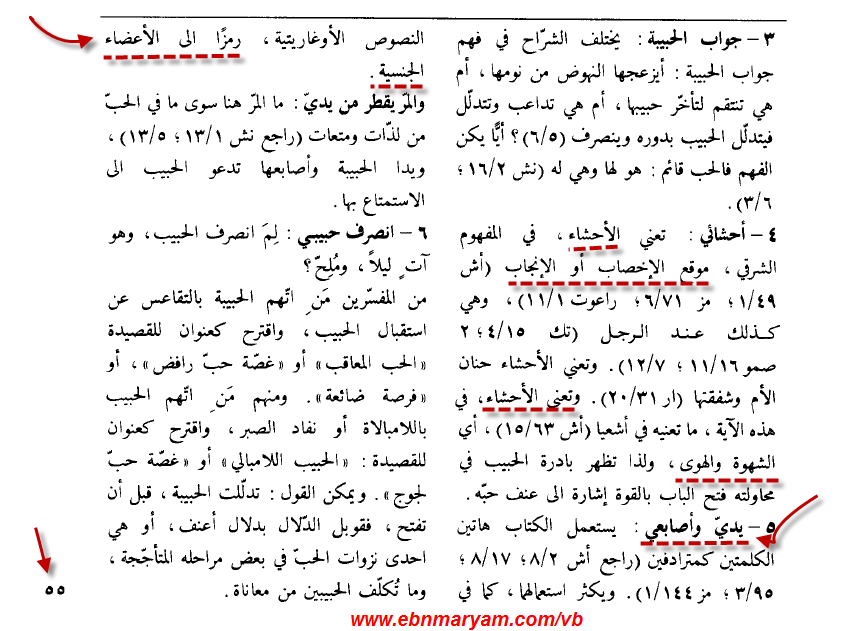 * فرجها = وما العيب في كلمة الفرج ؟ كل الكتب العربية في العالم تذكر هذا الفظ ولا عيب في ذلك أظن أنها أنظف بكثير من قول :{حَبِيبِي مَدَّ يَدَهُ مِنَ الْكَوَّةِ، فَأَنَّتْ عَلَيْهِ أَحْشَائِي} وإيده وصلت لأحشائها من أي كوة ؟ ، يمكنك مشاهدة غلاف إحدى كتب الصادر من "كلية اللاهوت الحبرية " وهي تنشر صورة قضيب ذكري (اضغط يا عبقري زمانك)