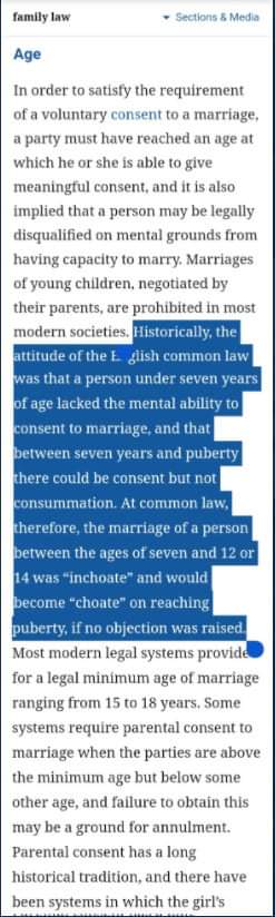 لموسوعة المعارف البريطانية encyclopedia و من صفحة ا/ كرم عثمان طبقاً لنفس المصدر الموسوعة البريطانية فإن القانون الإنجليزي في العصور السابقة كان يبيح الزواج عند بلوغ سبع سنوات للشاب والفتاة.