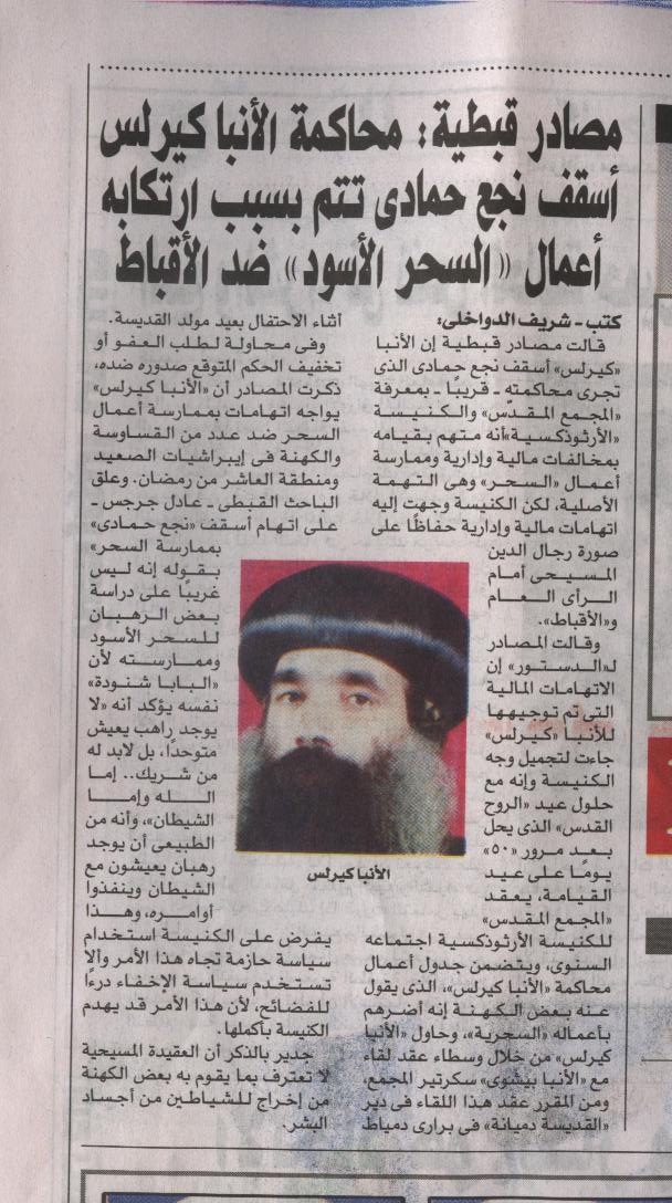 فى الحقيقة كل ما نقلته الجريدة التى أنتم بصدد الفرحة بها ما هى إلا أكاذيب فأنا من داخل الكنيسة أؤكد لكم أن لا يوجد سحر فى المسيحية ولا يستطيع الشيطان أن يكون فى مكان موجود فيه المسيح وأن كل ما يحدث فى هذا الموضوع هو عبارة عن أخطاء موضوعية تناقشها لجنة المجمع المقدس ويكفى أن أقول أن المحاكمة الموضوعية لهذا الأسقف أفضل كثيراً من الخناقة فى غرف الشات والفضائيات وأرجو أن تشاهدوا قناة أقرأ وتتعظوا ..