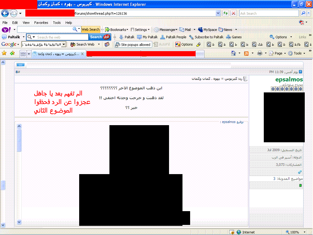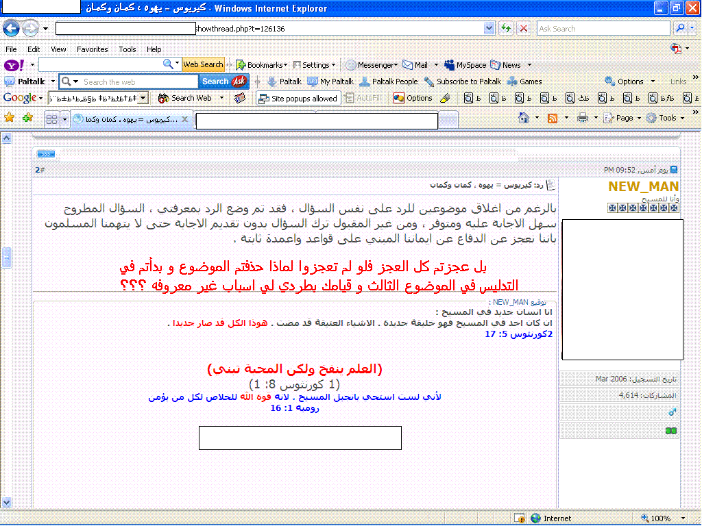 في الموضوع الثالث الذي كتبه مشرفهم حذفت ردود اعضائهم جوسبل اوف تروث و ابسالموس علي التوالي حين أقتبست ردودهم ...