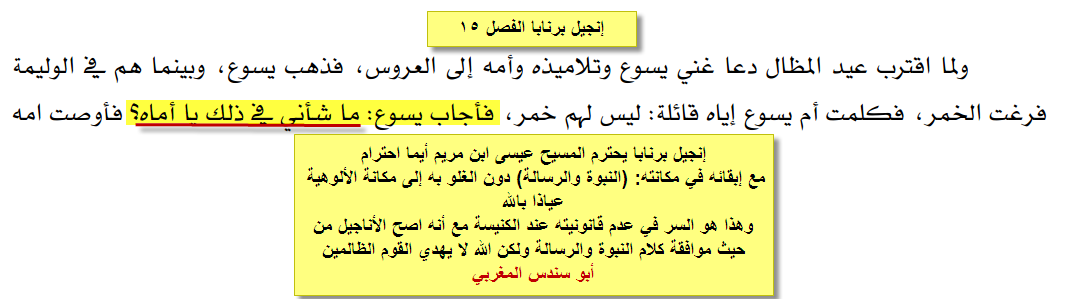 ونفس القصة يرويها التلميذ القديس برنابا ولكن بتغيير عبارة: (ما لي ولك يامرأة) بعبارة: (ما شأني في ذلك ياأماه)