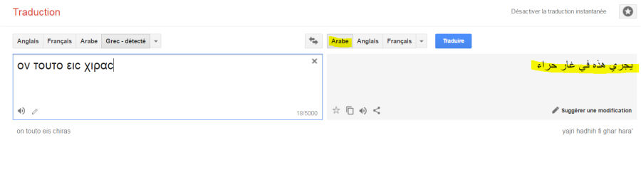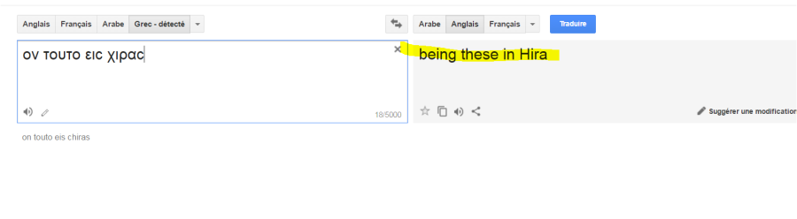 ملاحظة هناك تدليس حتى في العبارة βιβλιον τουτο ειϲ χιραϲ ανθρωπου و من المفروض لازم الكتاب أن يضعوها هكذا βιβλι ον τουτο ειϲ χιραϲ ανθρωπου مفرّقة كما وضعتها لكم أتعلمون لما ؟؟؟لكي لا تظهر عبارة و يجري هذا في …… التي تدل على مكان لكي يستطيعوا في اكمال بوضع “في أيادي ” بدلا من ” في غار حراء “و الحمد لله المخطوطة تبين تناسق الأحرف الكبيرة و يمكن أن ننسخها كما ذكرت βιβλι ον τουτο ειϲ χιραϲ ανθρωπου نأخذ ما يهمنا ( ον τουτο ειϲ χιραϲ ) كما هي بالمخطوطة و كما شاهدتم في الصورة الأخيرة نضعها في قوقل المترجم في عدة لغات و نرى هل هناك اختلاف لما نترجمها ام لا كما رأيتم لا يوجد اختلاف و الاهم ما في الامر لما ترجمنا الكلمة بعدة لغات لم تتغير الكلمة Hira و هذا يدل على أنها اسم مكان و علم