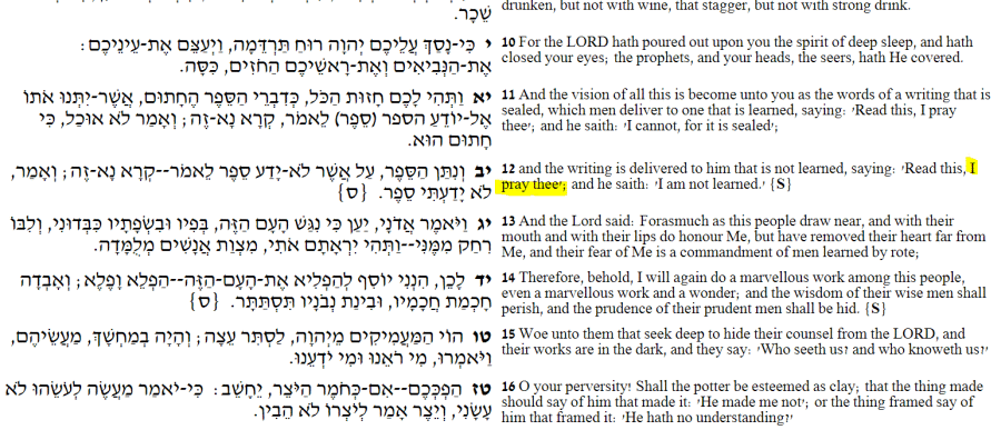 أو كما جاء في ترجمة ملك جيمس الذي نجد فيه و انا اصلي عليك And the book is delivered to him that is not learned, saying, Read this, I pray thee:and he saith, I am not learned.و التي تأكده العبريةיב וְנִתַּן הַסֵּפֶר, עַל אֲשֶׁר לֹא-יָדַע סֵפֶר לֵאמֹר–קְרָא נָא-זֶה; וְאָמַר, לֹא יָדַעְתִּי סֵפֶר. {ס}ننتقل الى الموقع العبرى انرى ترجمة اليهود لكتابهم للتأكد יב וְנִתַּן הַסֵּפֶר, עַל אֲשֶׁר לֹא-יָדַע סֵפֶר לֵאמֹר–קְרָא נָא-זֶה; וְאָמַר, לֹא יָדַעְתִּי סֵפֶר. {ס} 12 and the writing is delivered to him that is not learned, saying: ‘Read this, I pray thee’; and he saith: ‘I am not learned.’ {S}http://www.mechon-mamre.org/p/pt/pt1029.htm