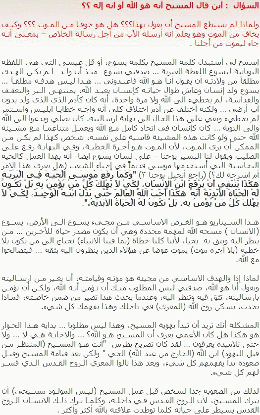 الجواب: إسمح لي أستبدل كلمة المسيح بكلمة يسوع, أو قل عيسى التي هي اللفظة اليونانية ليسوع اللفظة العبرية … صدقني يسوع منذ أن ولد لم يكن الهدف مطلقاً من ولادته أن يقول أنا هو الله فاعبدوني … هذا ليس هدفه مطلقاً … يسوع ولد إنسان وعاش طوال حياته كإنسان يعبد الله, بمنتهى البر والتعفف والقداسة, لم يخطيء الى الله ولا مرة واحدة, أنه كان كآدم الذي الذي ولد بدون أب أرضي … ولكنه أختلف عن آدم اختلاف كلي أنه واجه خطايا ابليس واستمر لم يخطيء وبقي على هذا الحال الى نهاية ارساليته. كان يصلي ويدعوا الى الله والى التوبة … كان كإنسان في اتحاد كامل مع الله ويعمل متناغما مع مشيئة الله حتى ولو كانت هذه المشيئة قاسية على نفسه, شخص كهذا لم يكن من الممكن أن يرى الموت, لأن الموت هو أجرة الخطية, وفي النهاية رفع على الصليب ويقول لنا البشير يوحنا – على لسان يسوع ايضا- أنه بهذا العمل كالحية النحاسية التي أستخدمها موسى قديماً في إحياء الشعب (هل تعرف هذا الامر أم اشرحه لك؟) (راجع أنجيل يوحنا 3) "وَكَمَا رَفَعَ مُوسَى الْحَيَّةَ فِي الْبَرِّيَّةِ هكَذَا يَنْبَغِي أَنْ يُرْفَعَ ابْنُ الإِنْسَانِ، لِكَيْ لاَ يَهْلِكَ كُلُّ مَنْ يُؤْمِنُ بِهِ بَلْ تَكُونُ لَهُ الْحَيَاةُ الأَبَدِيَّةُ أَنَّهُ هكَذَا أَحَبَّ اللهُ الْعَالَمَ حَتَّى بَذَلَ ابْنَهُ الْوَحِيدَ، لِكَيْ لاَ يَهْلِكَ كُلُّ مَنْ يُؤْمِنُ بِهِ، بَلْ تَكُونُ لَهُ الْحَيَاةُ الأَبَدِيَّةُ"..
