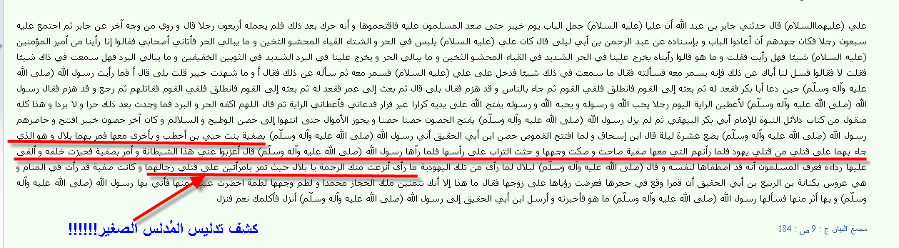و لكن المُدلس الصغير وجد أنه يتكلم مع السُنة، الذين ينظرون بعين الشك لبعض التخاريف الشيعية و إفتراءها لبعض الأحداث للتعظيم من شأن على و نسله (بالضبط كما يُعظم المُدلسون من شأن اليسوع و شلة المقاطيع التى تحلقت من حوله ..... و لكن بدرجة أقل بكثير و أهمها بالطبع، عدم نسبة الألوهية أو النبوة لعلى (رضى الله عنه)) ....و هكذا فآثر المُدلس ، هو أو من يتخذه كأداة، أن ينسبها إلى مرجع سُنّى ....لعلها تعدى و يشربها المُسلمين ، و ينخرطوا فى الدفاع عن نبيهم و بيان أن النبى كان يقصد الرحمة ...... و مع ذلك فإن حتى الموقع الشيعى يُبين أن الرسول راجع بلالاً لأنه طاف بالسيدتين على قتلاهما و عنفه على ذلك !!!!