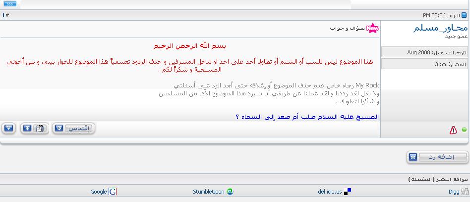 قمت بالتسجيل في أحد المواقع الصليبية باسم ( محاور_مسلم )
