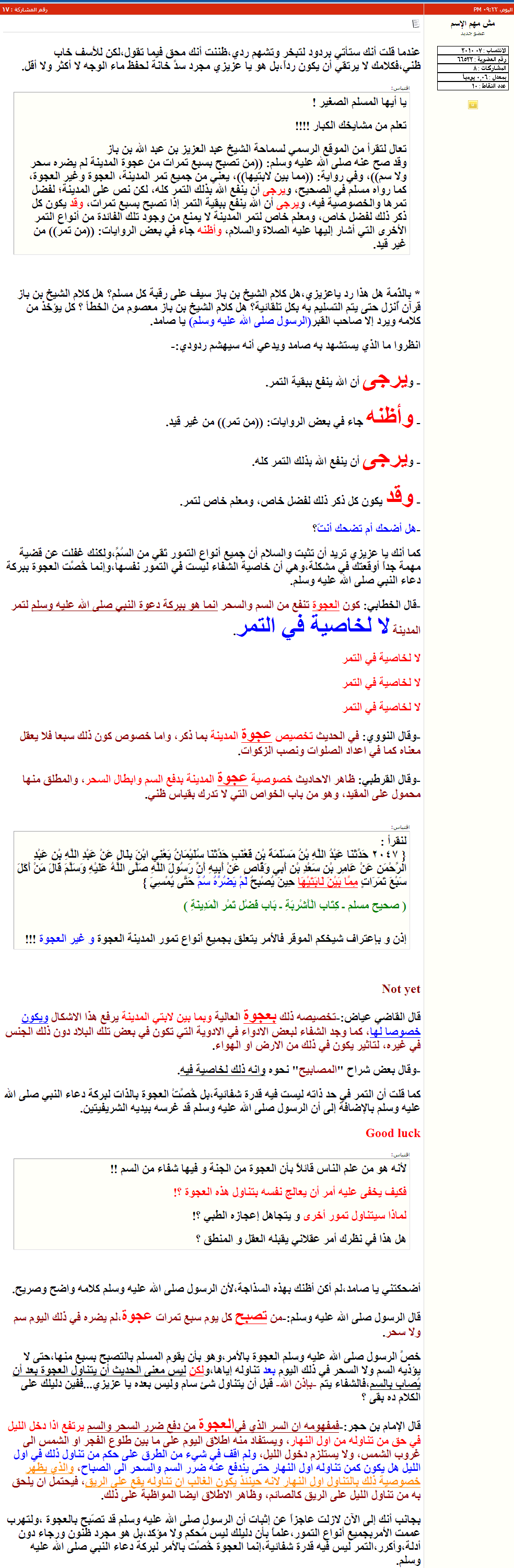 كما أنك يا عزيزي تريد أن تثبت والسلام أن جميع أنواع التمور تَقي من السُمَّ,ولكنك غفلت عن قضية مهمة جداً أوقعتك في مشكلة,وهي أن خاصية الشفاء ليست في التمور نفسها,وإنما خُصَّت العجوة ببركة دعاء النبي صلى الله عليه وسلم.