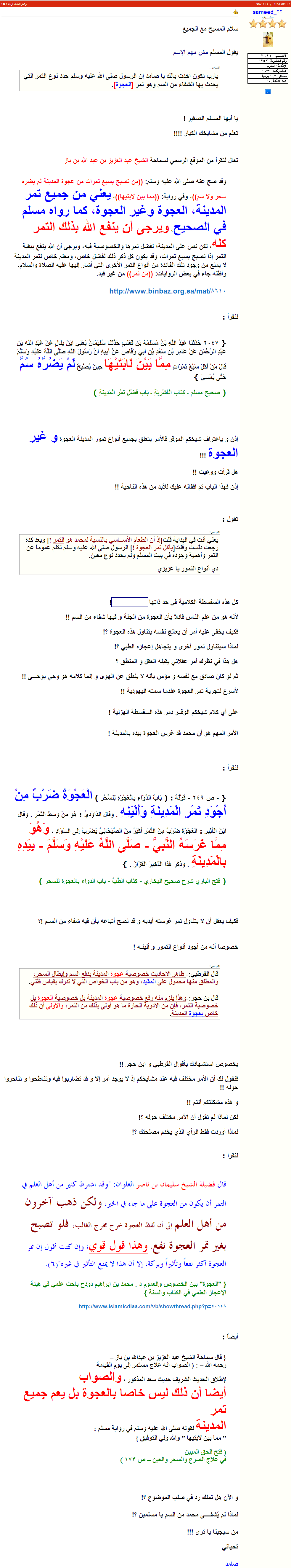 ,ولكن الرد الطبيعي بتاعهم,إن المسلم مصدوم ومش عارف يرد,والرد بسيط جداً وهو إن الرسول :salla-s: حدد نوع التمر الذي يحصل به الشفاء وهو تمر العجوة,بجانب إن الشفاء لا يحدث بعد الإصابة بالسم,ولكن قبله,ولذلك قال الرسول:salla-s: (تصبحوا) أي في أول النهار قبل أن يدخل أي سم للجسد,ولم يأمر الرسول:salla-s: بتناول العجوة بعد التسمم؛لذلك لم يتناولها الرسول:salla-s: عندما أكل الشاة المسمومة.